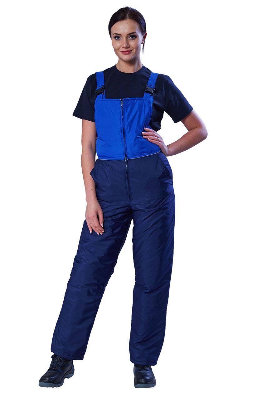 Полукомбинезон утепленный с притачными полочками спереди. Центральная застежка на тесьму «молния». Передние половинки с карманами с отрезным бочком. Спинка с притачной кокеткой, верхний край которой – фигурный. СВ кант расположен по шву притачивания кокеток.